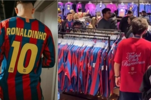 在周日对阵赛前,巴萨球员全员身着印有罗纳尔迪尼奥10号的2005/06赛季巴黎欧冠决赛版球衣亮相,这一致敬经典的举动迅速点燃了球迷的购买欲。