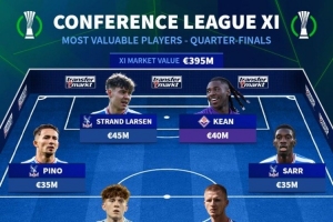 体育资讯4月9日讯 德转官网公布了本赛季欧协联1/4决赛身价最高十一人阵容,英超水晶宫独占九席。德转对此阵容的解读也十分简明扼要:“显然,这就是水晶宫是本赛季欧协联冠军大热门的原因。”