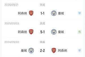 虽然不久前的联赛杯决赛阿森纳0-2不敌曼城,但枪手在英超对曼城已5场不败(2胜3平),其中客场分别是0-0、2-2。